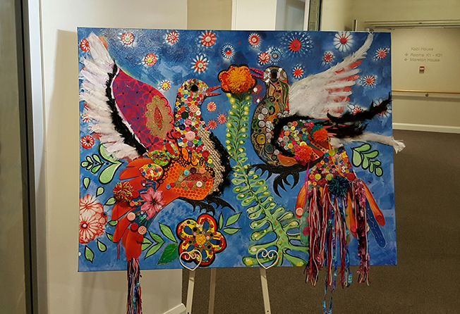 The residents at Seabrae Manor Aged Care Living, together with the Term 4, Visual Art Students of Grace Lutheran College recently teamed up to create a stunning interactive sensory piece of artwork. The artwork is of two seagulls hovering over a tree branch with a blue floral painted background. It is designed from a mix of different materials. The painting is the first phase of a 3 stage ‘Sensory Enhancement Project’. The project is designed to encourage senior residents, especially ones with dementia to participate in stimulating activities. These activities are important and encourage self-expression, foster emotional connections with others, stir memories and lessens anxiety. It is these relationships, hobbies and interests that reduce the effects of severe cognitive impairment, leading to a better quality of life. The artwork is interactive so that residents can feel and touch the different materials and surfaces to stimulate different senses and emotions. Joyce Stephan of Seabrae Manor Aged Care Living also saw the project as an opportunity to involve the local community and was delighted when the students from Grace Lutheran College were willing to help. The artwork took 6 weeks to complete and the residents looked forward to the student’s arrival each week to work on it. Together the visual art students and residents used their artistic skills to paint, sew on buttons which formed the bodies of the birds, created pom poms, glued on feathers to the wings of the birds, shells were placed around the head, and they stuck on strands of wool and ribbon to make the tails. Whilst creating this artwork piece, the students interacted and chatted with residents learning of generational differences, shared stories, had some laughs and helped each other. An afternoon tea was held at Seabrae Manor Aged Care Living to present the project. The attendees included residents, resident’s family members, students that worked on the artwork and the Grace Lutheran Collage Principle, Ruth Butler. Joyce Stephen spoke about the objective of the project and being thrilled with how it had unfolded. There was a presentation of lovely photos seeing the different generations of students and residents working together and finally there was the unveiling of the stunning artwork much to everyone’s delight. Ruth Butler was so impressed by the artwork that she organised for the design to be turned into Christmas card for the school. The residents at Seabrae Manor Aged Care Living look forward to stage 2 of the project and working with the students again. For further information of Seabrae Manor Aged Care Living, please call Joyce Stephan – Business Development Manager on (07) 3053 3333. Click here to find out about the ‘Use of Creative Arts in Dementia’. If you like further information on Dementia and Alzheimer’s go to: www.fightdementia.org.au or www.alzheimersonline.org #SeabraeManor #QualityAgedCare #AgedCare